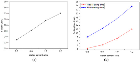 Flow and setting curves of slurry with different water–cement ratios. (a) Fluidity curve; (b) Setting time curves.