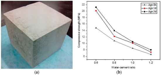 As shown in Figure 13, the compressive strength of slurry consolidation is decreased with the increasing of water–cement ratio. The compressive strength of slurry consolidation is more than 10 MPa until the water–cement ratio is decreased to 1.0.