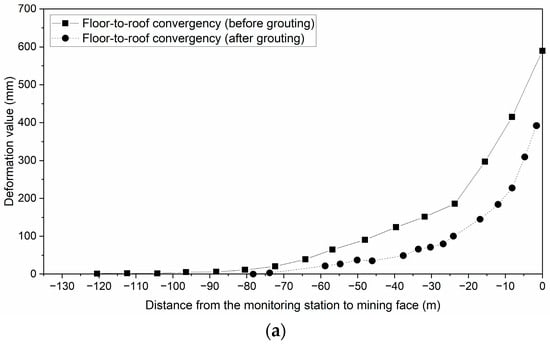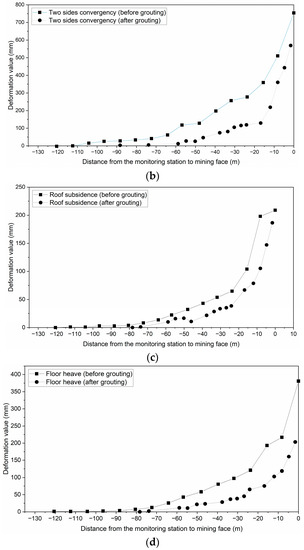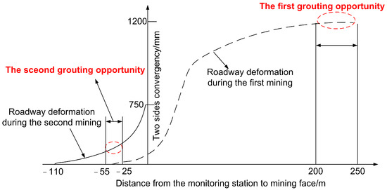 A reasonable grouting opportunity is crucial for grouting engineering. The reused roadway suffered twice from the dynamic pressure of coalface mining. When the roadway has not been affected by the dynamic pressure of coalface, the surrounding rock of the roadway is relatively stable and its permeability is poor, and thus the slurry is difficult to be injected into the surrounding rock. After the roadway suffers from the dynamic pressure of coalface, some cracks are produced in the surrounding rock and develop gradually, which provides the possibility for large-area grouting [45,46]. Therefore, the grouting opportunities should be determined according to the evolution of the dynamic pressure of coalface and the deformation characteristics of the reused roadway.