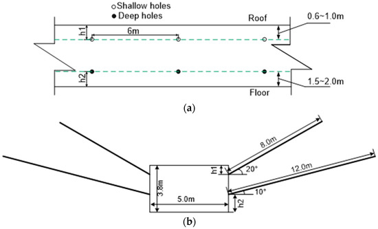 Shallow holes were adopted for upper drilling and deep holes were adopted for lower drilling. The depths of the shallow and deep holes were 8 m and 12 m, respectively. The drilling diameters were both 42 mm, and the elevation angles of shallow and deep holes were 20° and 10°, respectively. The distance h1 (from opening position of shallow holes to the roadway roof) was 0.6~1.0 m, and the distance h2 (from opening position of deep holes to the roadway floor) was 1.5~2.0 m. The distance between two adjacent holes in each row was 6 m.