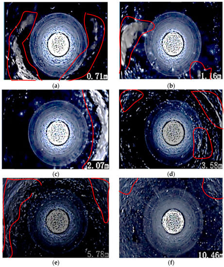 Borehole peeping results after grouting. (a) Depth = 0.71 m; (b) Depth = 1.16 m; (c) Depth = 2.07 m; (d) Depth = 3.58 m; (e) Depth = 5.78 m; (f) Depth = 10.46 m. The one in the red circle is the slurry filling the cracks.