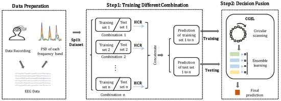 To utilize the interacted information from different frequency bands, the emotion recognition framework that uses the combinations of all the adjacent frequency bands is designed to mine the complementary information as much as possible. The entire process is shown in Figure 1. In the data preparation process, the raw EEG signals are preprocessed for power spectrum density (PSD) extraction. After that, in the first step of the framework, the combinations of the adjacent frequency bands are considered as a subset, each subset is divided into a training subset and testing subset, respectively, and each training subset and the corresponding testing subset are both tested by the homogeneous-collaboration-representation-based classification (HCRC) method. In the second step, the testing results of all the training subsets and testing subsets are spliced together, respectively, to form a testing decision set and a training decision set. Then, the circular multi-grained ensemble learning (CGEL) method is used to complete the decision fusion and obtain the final classification result of the testing decision set.