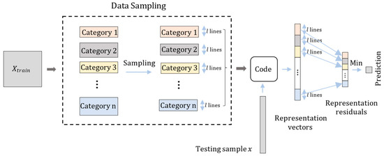 Each category has a regularized residual , and the category with the minimum regularized residual is the classification result of the HCRC method. For each sampled , under certain sparsity constraints, only needs a small number of samples to represent , which proves that the imbalance of samples has little effect on the classification results. Therefore, it is suitable to process the training sets of different categories into the same numbers of samples, and this will make the dimension of in each type of training set the same. In addition, the differences between the regularized residuals of each category are small, so the units of data magnitude may slightly influence the classification results. In order to eliminate that impact, we normalize the data before putting it into the HCRC method.