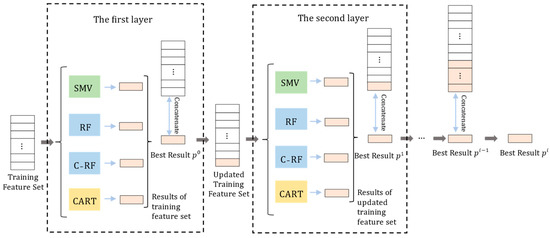 The training process of ensemble learning is shown in Figure 4. All the samples of the and are, respectively, scanned to generate the corresponding concatenated vectors to compose the training feature set and testing feature set before training. For , four prediction results are generated by RF, CRF, DT, and SMV through self-training of , and from the four results, the best result with the highest prediction accuracy is chosen as the enhanced feature. is concatenated with to generate an enhanced training feature set as the second layer input. There are also four predicted results in the second layer. If the best result from the four results of the second layer with highest prediction accuracy is better than , in this layer will be concatenated with to generate a new enhanced training feature set as the next layer input. In addition, the process continues until the highest prediction accuracy does not increase any longer or the number of iterations reaches a threshold.
