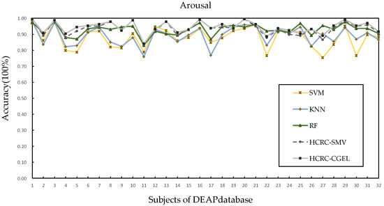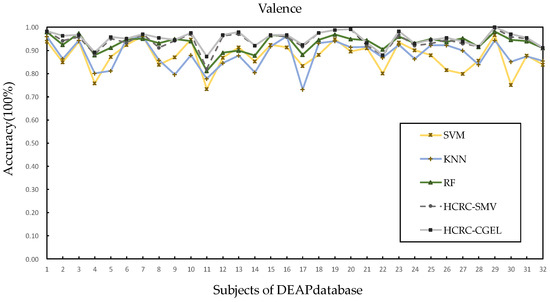 In this section, the five-fold cross-verification prediction results are verified in arousal and valence on the DEAP database through the comparison of HCRC-CGEL with SVM, KNN, RF, and HCRC-SMV. Figure 5 and Figure 6 show the prediction results of arousal and valence on 32 subjects, respectively. As shown in these two figures, the overall trend of each method is roughly the same in arousal and valence. Compared to SVM, KNN, and RF, HCRC-CGEL and HCRC-SMV have the highest prediction accuracy in all the subjects. In addition, the prediction accuracy of HCRC-CGEL in arousal and valence is higher than that of HCRC-SMV on most subjects. However, the prediction results of SVM are unstable. This may be the reason that the SVM does not find the optimal classification surface in the binary classification in some subjects.