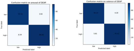 The average accuracies of arousal and valence on all subjects of each method are shown in Table 2. The prediction accuracies of HCRC-CGEL are 94.93% in arousal and 95.09% in valence, which are much higher than those of SVM, KNN, and RF. Compared with HCRC-SMV, the accuracy rates of arousal and valence are increased by 1.05% and 0.83%, respectively. This proves that in the DEAP database, our decision fusion method outperforms simple majority voting. In the prediction results of the compared method, RF performs better than KNN and SVM on almost every subject, and the mean accuracies of RF are higher than those of KNN and SVM on the arousal and valence of the DEAP dataset. Figure 7 shows the confusion matrices of HCRC-CGEL on the DEAP database. The accuracy of low arousal and valence is, respectively, 93.41% and 96.08%, and that of high arousal and valence is, respectively, 94.19% and 95.82%. In addition, the precision and recall rates of arousal are, respectively, 95.06% and 94.75%, and those of valence are, respectively, 94.65% and 95.33%. The standard deviations of HCRC-SMV and HCRC-CGEL are 3.33 and 3.00 on arousal, and 3.40 and 2.90 on valence, respectively, which is lower than those of other methods. This means that our framework has good results on the DEAP database.