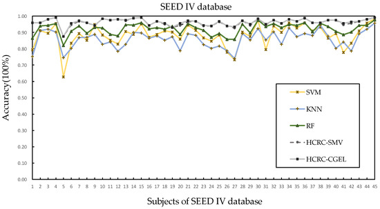 In this section, the five-fold cross-verification prediction results of a four-category classification problem are verified through the comparison of HCRC-CGEL with SVM, KNN, RF, and HCRC-SMV on the SEED IV database. In Figure 8, the overall accuracies of HCRC-CGEL and HCRC-SMV are higher than those of SVM, KNN, and RF, and RF outperforms KNN and SVM. The prediction results of HCRC-CGEL are better than those of HCRC-SMV for most subjects in the three sessions.