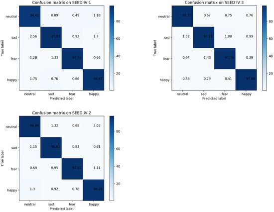 The SEED IV [40] database records the EEG signals of 15 subjects (7 males and 8 females) through inviting them to watch emotionally stimulating videos. Each subject has to watch 24 stimulating videos with four emotional states (happy, sad, fear, and neutral) for about seconds on three different days. This means that the SEED IV database has three sessions, each with 15 trials. For each participant, the EEG signals are recorded with 62 channels and a 1000 Hz sampling rate, and the labels of the recorded EEG signals are the emotion states of the corresponding video.