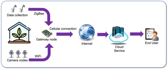 Figure 1 shows the IoT on-site scenario for the SAgric-IoT platform. The architecture consists of four main nodes: the sensor nodes, the camera nodes, the gateway node, and the processing and storage node. Sensor nodes gather data from all sensors and periodically send it to the gateway node via other sensor nodes or directly, depending on the node’s distance from the gateway node. They are deployed on the greenhouses and establish a wireless network (based on 802.15.4) to communicate among themselves using radio-frequency links. The camera nodes send the images via Wi-Fi to the gateway node, where the trained CNN model for plant disease detection is stored. When the model identifies a possible disease situation in the crop area, a notification indicates the camera’s location and the detection image. A gateway node is also deployed along with the sensor nodes to enable a connection between the SAgric-IoT platform and the Internet (cloud server). The gateway node supports three communication interfaces: ZigBee to maintain communication with the sensor nodes, Wi-Fi to connect to the camera nodes, and a cellular interface to transmit data to the storage and processing node. A farmer has remote access to the gathering data to know the greenhouse conditions and control the different sensor and actuator devices and alert notifications when the CNN model detects a crop health problem situation. The gateway node includes a cellular network interface to transmit all gathered data to the cloud server. A web and mobile application were created as a cloud service to consult data information, receive alert notifications, and decide about control systems.