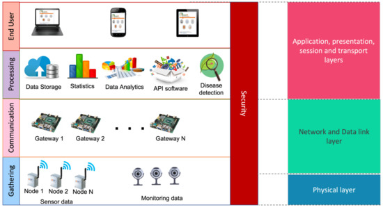 The SAgric-IoT design complies with the remote monitoring needs, contributing to reducing human resource investment. SAgric-IoT defines a five-layered model (as shown in Figure 2) with a transparent interconnection of all platform components and data dissemination in the agriculture precision area. The defined architecture covers all seven OSI model layers, as described in the following sentences. The gathering layer comprises the data link and physical layers. The communication layer is integrated with the data link and network layers. Finally, the processing and end-user layers are directly related to the four upper layers (transport, session, presentation, and application). The security layer is a transversal layer that interacts with the other layers of the architecture to obtain an end-to-end security level.