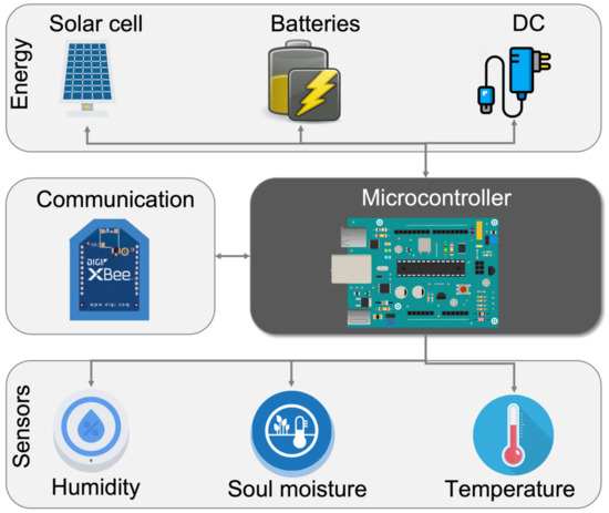 The main challenge of the design of the SAgric-IoT was to build low-cost and energy-efficient hardware capable of monitoring, gathering, and controlling physical parameters. The hardware board comprises four modules: microcontroller, sensors and actuators, energy, and a wireless communication module, as shown in Figure 4.