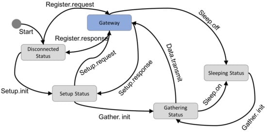 Our protocol defines three types of nodes: end-node, routing, and gateway. End-node nodes gather data from the sensors but cannot retransmit data to other sensor nodes. Routing nodes are responsible for collecting and retransmitting data from different sensor nodes. They also maintain a routing table that allows nodes to choose the best route for data transmission. Finally, the gateway node is the central node that receives all the gathered data from different sensor nodes and sends it to the Internet. Figure 7 shows the state diagram for the protocol.