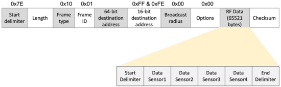 The message contains frame control fields, destination address fields (in our case, we used 16-bit destination addresses), a data field where the data from the different sensors are included, and a checksum field to check that the message is not corrupted. This frame is sent to the gateway node through the data.transmit message. When the sensor node finishes sending data, it changes its status to Sleeping status (Sleep.on) to save energy for an established period. All sensors in the node and the microcontroller are off, and the node is considered a sleep node. When the sleeping time finishes, the sensor node wakes up and starts another data-gathering session from the sensors, or when the gateway node sends a request for information on data from the sensors. After the node gathers data and sends it to the gateway node, it goes to sleep again to save the battery (Sleep.on).