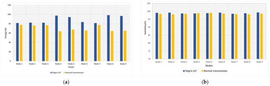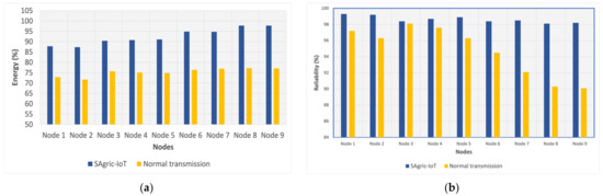 We evaluated SAgric-IoT performance by analyzing the nodes’ energy consumption and reliability. Moreover, we examined the performance of the SAgric-IoT protocol in comparison with an average transmission model without a sleep function into the node.