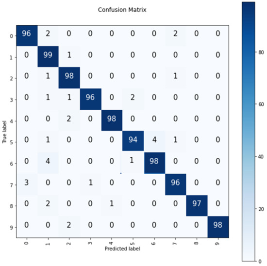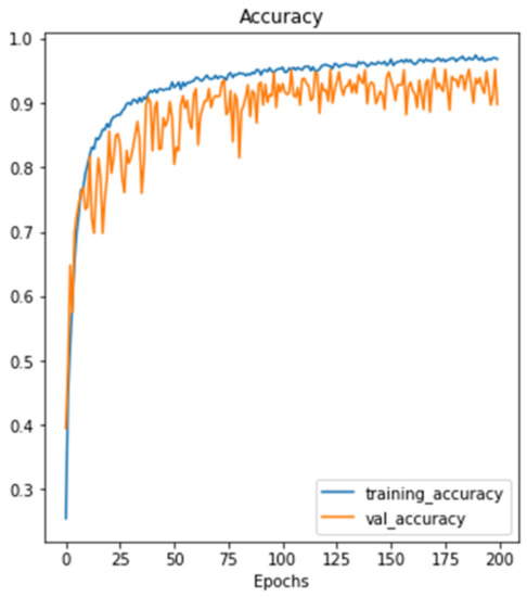 Table 5 shows the parameters for training the model and the Adam optimization algorithm. The model’s loss function was categorical_cross_entropy, one of the most widely used functions for multi-class classification. The number of epochs was 200.