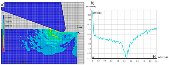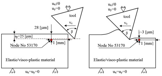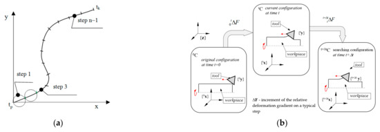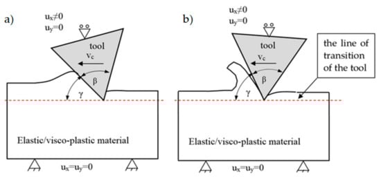 Issues related to incremental description were presented in some works, e.g., in the paper by M. Kleiber, various concepts of incremental descriptions in non-linear mechanics were analyzed. An updated Lagrange description (Figure 2) was adopted to describe the wedge displacement process, which is characterized by high universality, based on the assumption of an additivity of individual deformation components on the original or current configuration. This concept of incremental description and algorithms of solutions developed for typical incremental step time has already been used by the Authors for numerical analyses of other technological processes of plastic forming, i.e., cutting [65,66,67,68,69,70,71,72], thread rolling [73], burnishing [74,75,76,77,78], drawing [79,80,81], grinding with a single abrasive grain [82] and for analyses of large plastic deformations and for predicting fatigue strength and product life [83,84,85], and it has been positively verified.