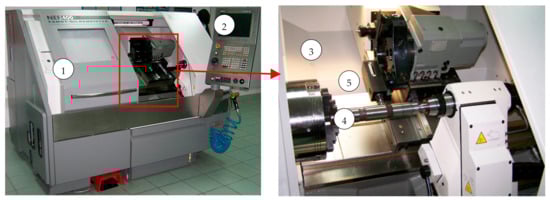 General view of the NEF 400 CNC machining center: 1—front view, 2—control panel, 3—working space; 4—shaft (sample) made of 41Cr4 steel, 5—tool holder with a diamond burnishing tip.