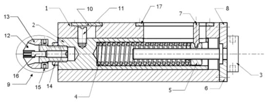 Technical drawing of the burnishing device: (1) body, (2) guide shaft, (3) adjusting screw, (4) spring, (5) retaining nut, (6) stop plate I, (7) indicator, (8) stop plate II, (9) burnishing head, (10) blanking plate, (11) stop pin, (12) clamping sleeve, (13) clamping sleeve of diamond tip, (14) counter nut, (15) clamping nut, (16) set screw, (17) scale plate.