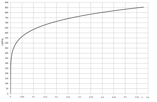 The non-linearity of the object material was described using an incremental model, taking into account the influence of the strain history and the strain rate. The object is treated as a body in which elastic deformations (in the range of reversible deformations) and viscous and plastic deformations (in the range of irreversible deformations) may occur with non-linear hardening. This body was abbreviated as E/VP. The non-linear Huber–Mises–Hencky (abbreviation: HMH) plasticity condition, associated flow law and mixed reinforcement (isotropic-kinematic) were used to build a material model. The state of the material after the preceding treatments was also taken into account by introducing the initial states: displacements, stresses and strains.