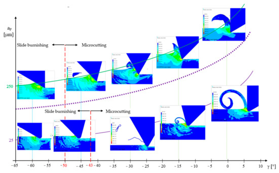 Sliding burnishing, similarly to micro-cutting, can be treated as a process of moving a wedge (tool) over a workpiece. For a given tool geometry (vertical angle β and radius of cutting edge rounding rd) and machining depth ap, there is a limit rake angle at which material flash is formed in front of the tool, but no chip is formed. Thus, for rake angles , the sliding burnishing process takes place, while for , the flash turns into a chip and then the micro-cutting process takes place (Figure 1).