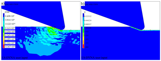 In Equations (13)–(15) are the components of the increment of the tensor of total strain (elastic, plastic and viscous), is the fourth-order tensor characterizing the elastic properties of the object material, is a cumulative component of the stress deviator at the time t considered, is the instantaneous strain-hardening modulus, is the instantaneous strain rate-hardening modulus, is the instantaneous modulus of translational hardening and is the instantaneous plasticizing stress of the object material, depending on the instantaneous values of the effective deformation and visco-plastic strain rate .