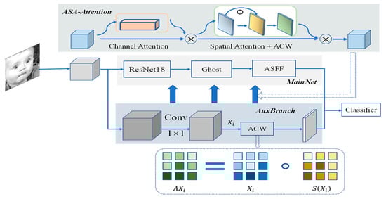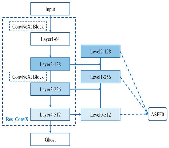 The backbone of MainNet is built according to ResNet18 [23] and integrates the ConvNext Block. At the same time, considering the large amount of network parameters, the deep structure of ResNet18 is replaced by the Ghost [24] module to complete the main feature extraction network construction. Finally, in order to obtain more complete facial features, feature fusion is performed again using the ASFF [25] structure. The fusion process is shown in Figure 2.