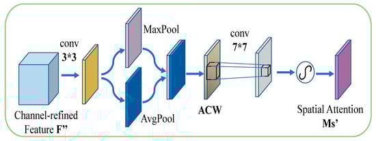 The ASA module is a fusion modification of the attention mechanism of CBAM [26]. The modification of the ASA module in this paper is only for the spatial attention part, and the channel attention part remains unchanged. Specifically, in the input part, compared with the original module, the ASA module first adds a 3 × 3 convolutional layer; secondly, after the maximum pooling and average pooling, the channel weighting idea, ACW, is incorporated, and then enters the next convolutional layer.