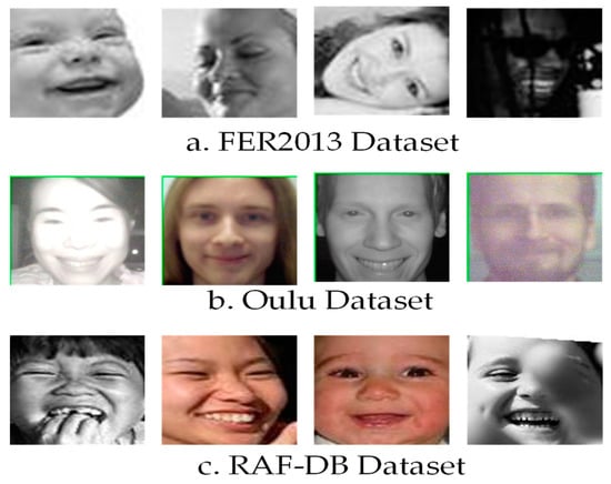 In order to verify the effectiveness of the network proposed in this paper, this paper selected the public datasets FER2013, Oulu_CASIA and RAF-DB for experimental verification of seven types of basic expressions. Figure 8 shows some pictures from the dataset. The selected dataset covers images of faces in different lighting, skin tones, poses and occlusions.