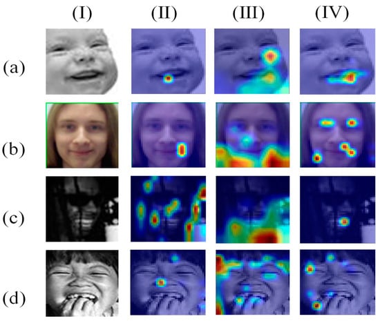 First, column (I) randomly selects four pictures a, b, c, and d from the dataset according to lighting, occlusion, and posture. Column (II) corresponds to experiment ⑤, which is the attention visualization result with the addition of ACW mechanism. Compared with the baseline network, the addition of ACW enables the network to pay more attention to expression-related regions; Column (III) corresponds to the above experiment ⑦. In order to add the visualization result of the attention module ASA proposed in this paper, it can be seen from the results of this column that the network can pay more attention to key information areas such as the mouth, eyes and nose; Column (IV) is the attention visualization result of the network MAWNet proposed in this paper. It can be clearly seen that the network better integrates each effective module, can more clearly locate the key areas of expressions, and improve the network recognition accuracy.