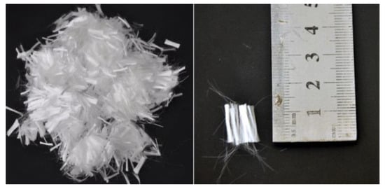 In all compositions, three types of HRWAs based on lignosulfonates and polycarboxylic ethers were applied. Their total amount was kept at 3% of the weight of binders in all mixes. The HRWA dose was selected to obtain the slump flow of 720 ± 10 mm for the reference blend, meeting the requirements for the SF2 flow class in accordance with the European guidelines [41]. The total amount of cementitious materials was 650 kg/m3 and the W/B ratio was maintained at 0.32. As a coarse aggregate, gravel with a maximum diameter of 8 mm was used in the amount of 400 kg/m3. Quartz sand with a fineness modulus of 1.84 and a grain size of 0.5/2 mm was used in the amount of 980 kg/m3. The particle sizes of gravel and quartz sand were determined in accordance with a known standard. The polypropylene fibre was provided by BAUCON® Co. (BAUTECH®, Piaseczno, Poland). It was crimped with 12 mm length and 25 µm diameter filaments. Other PP fibre properties, based on the manufacturer’s technical data, were as follows: density 910 kg/m3, modulus of elasticity 35,000 N/mm2 and tensile strength = 350 N/mm2. Polypropylene fibres used in this study are shown in Figure 1.