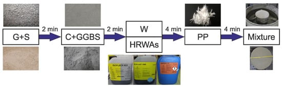 The mixing procedure for PPHPSCC is presented in Figure 2. The order of adding the mix components was as follows: gravel and quartz sand (G+S), cementitious materials (C+GGBS), uniformly mixed water (W) with three types of HRWAs, as well as polypropylene fibres (PP). The times of mixing for above components were 2, 2, 4, and 4 min, respectively. Then, the L-box and slump flow tests were performed. After the tests of rheological properties, the moulds were filled with concrete and left covered with foil for 24 h in the laboratory. The specimens were then demoulded and placed in a tank with water at 20 ± 2 °C to mature for testing.