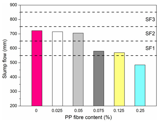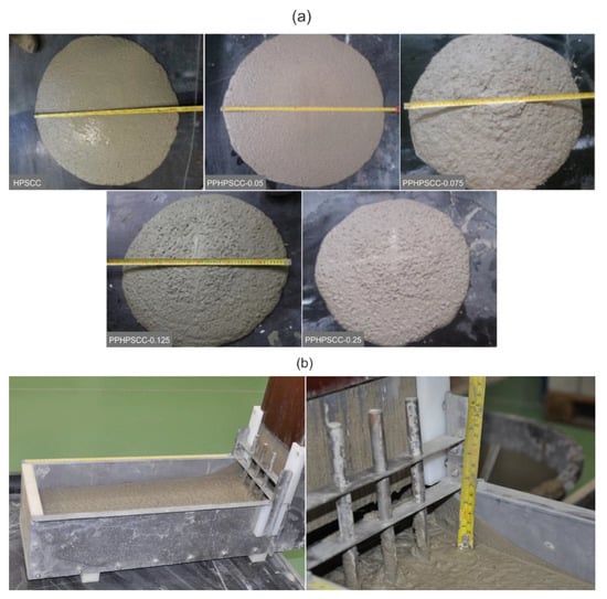 Figure 3 illustrates the typical slump flow diameter measurement and height of L-box filling. The slump flow diameters of the reference HPSCC and PPHPSCCs mixes are shown in Figure 4. The HPSCC control mix reached the maximum flow diameter of 722.5 mm. The diameter of PPHPSCC mixes flow were within the range of 570–715 mm. Except for the PPHPSCC-0.25 mix with the highest content of PP fibres, the slump flow diameter of other mixes complied with the requirement of European guidelines for SCC [41]. The HPSCC, PPHPSCC-0.025, and PPHPSCC-0.05 mixes were categorised as SF2 class, as the slump flow results were in the range of 660–750 mm. The mixes of class SF2 are appropriate for columns and walls. On the contrary, the PPHPSCC-0.075, and PPHPSCC-0.125 mixes were categorised as SF1 class due to the obtained flow diameters between 550 and 650 mm. The mixes of SF1 class are appropriate for tunnel linings, housing slabs, deep foundations and piles.