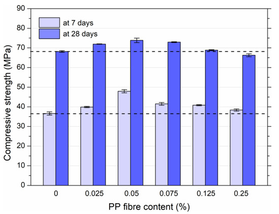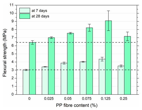 Flexural strength tests were performed at 7 and 28 days. Figure 12 displays the differences in the flexural strength of HPSCC with the various PP fibre contents.