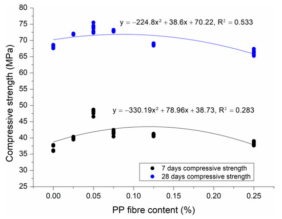 Correlations between 7 day or 28 day compressive strength and volume content of PP fibre.