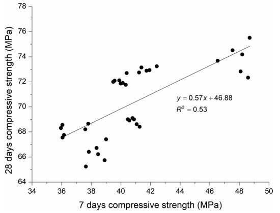 Correlation between 28 day and 7 day compressive strength for HPSCC and PPHPSCCs.