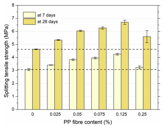 - Polypropylene fibres have noteworthy effects on the splitting tensile strength. The 7 day and 28 day strength improvements of PPHPSCC range from 11.5% to 38%, and from 15.5% to 44.5%, respectively, at the PP fibre volume contents of 0.025% to 0.25% in comparison with reference HPSCC. Greater increases in the splitting tensile strength are noted after 28 days of water curing.