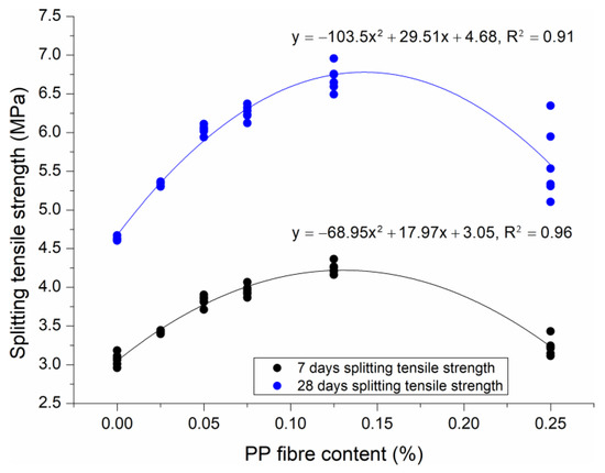 Correlations between 7 day or 28 day splitting tensile strength and volume content of PP fibre.