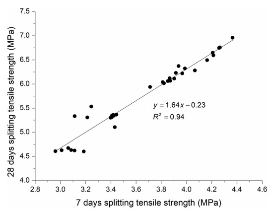 The greatest dispersion of the 7 day and 28 day splitting tensile strength results was noted with the highest content of PP fibres. This may be due to its agglomeration caused by a decrease in workability. Figure 11 exhibits the linear correlation between the 28 day and 7 day splitting tensile strength values of polypropylene-fibre-reinforced HPSCC. This correlation demonstrated a strong value of R2 = 0.94. The predicted equation for HPSCC after 28 days of water curing is specified by: