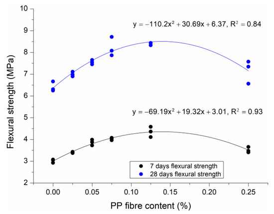 The optimally fitted curves on the basis of the flexural strength and fibre content are presented in Figure 13, and it is pronounced that there are strong relationships between 7 day and 28 day flexural strength and volume fraction of PP fibres concerning HPSCC. Based on the results, the following quadratic functions between 7 day and 28 day flexural strength as well as PP fibre content with favourable correlation coefficients R2 = 0.93 and R2 = 0.84, respectively are obtained: