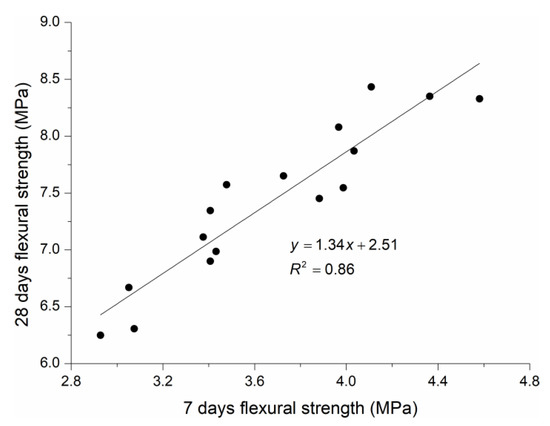 The obtained curves are analogous to those for HPSCC splitting tensile strength. Ostle [56] found that the model can be considered as a reasonable when the R2 coefficient is at least 0.7. For that reason, the obtained equations can be successfully used to predict the relations between the 7 day and 28 day compressive strength and the fibre content. According to the test data, the relation between the 28 day and 7 day flexural strengths PPHPSCC can be expressed as below, with Figure 14 presenting a comparison between the fitting linear function and test results. This relation established a quite strong value of R2 = 0.86 for HPSCC with PP fibre content.