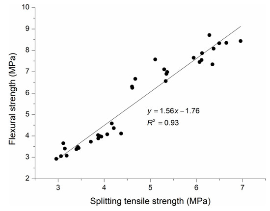 The linear relation between splitting tensile strength and flexural strength was obtained based on the regression analysis of the tensile strength results. Figure 15 and the following formula indicate the correlation between flexural strength and splitting tensile strength for HPSCC with PP fibres, which has a linear relationship with a strong coefficient of determination R2 = 0.93.