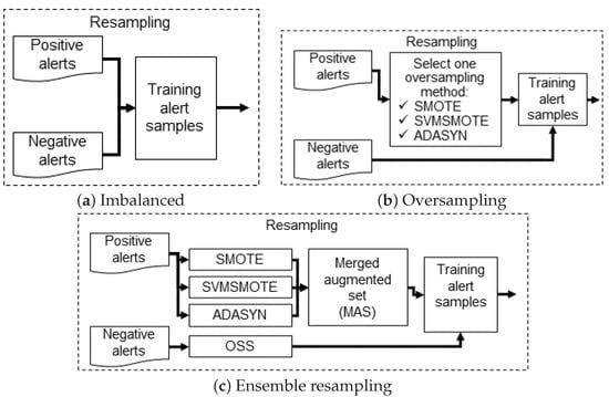 - Subsampling Negative Security Alerts: Data subsampling methods select data samples to retain or delete [57,60]. We found that approaches that combine deletion and retention work best for subsampling security alert data. We compared the performance of two data subsampling methods for data deletion and retention: one-sided selection (OSS) [6,61] and the neighborhood cleaning rule (NCR) [62]. These two algorithms were used to identify and remove ambiguous, noisy, and redundant security alert samples from the negative class.