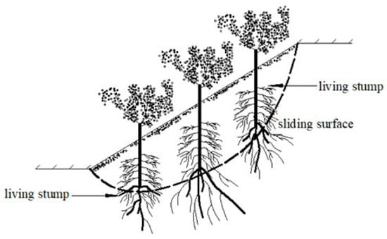 Plant roots have the functions of shallow root reinforcement and deep root anchoring [1,2,3,4], and they can effectively improve the stability of the slope [5]. The current ecological engineering technology mainly uses herbs, shrubs, or herbs combined with engineering protection, which can effectively reduce the occurrence of shallow landslides [6,7,8]. For example, vetiver grass can effectively prevent shallow landslides and improve slope stability [9,10,11]. As far as all the current ecological engineering protection technologies are concerned, although they have a good reinforcement effect on shallow landslides, they cannot reinforce deep landslides. Slope stabilization with living stumps is a new form of ecological engineering [12,13], which is to plant or drive living stumps with strong vitality into the soil. After a period of time, the living stumps will grow strong root systems, as shown in Figure 1. The root system of the living stump crosses the potential sliding surface of the slope; therefore, it plays a role in strengthening and protecting the slope.