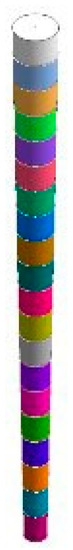 For the convenience of analysis and discussion, some assumptions were made: (1) It is assumed that the root system of living elm tree stumps will grow as expected after being planted in the soil, with a vertical and deep tap root and well-developed lateral roots. (2) The root system model does not consider roots with smaller diameters, such as fibrous roots and heart roots (roots with smaller diameters have less anchoring effect on soil) [31]. (3) The force and deformation of all roots are within the elastic range (regardless of the shape deformation of the root system, assuming that the Es of the root system remains unchanged). (4) The cross-sections of all roots are circular. According to the research of [32], the root diameter of 4–6 years old elms is mostly 10–15 cm, and that of 10–15 years old elms is mostly 15–20 cm. The tap roots of the elm trees branch out into lateral roots at a shallower depth, with many developed lateral roots [33]. Combined with the growth law of elm trees (as mentioned above), a simplified root system model with 1 tap root and 6 lateral roots was established by using embedded beam elements, and each root system was divided into 20 units. Six lateral roots branch at a distance of 25 cm from the top of the tap root, the included angle between each lateral root is 60°. The angle between the lateral root and the horizontal direction is about 20° (Figure 3). Both the tap roots and the lateral roots are simulated by variable cross-section groups (the diameter and length are linear). To simulate the growth of real elm trees, the diameter and length of the lateral roots will increase with the increase of the length of the tap root, as shown in Figure 4.