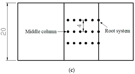 It can be seen from Figure 1 that when the tap root of the living stump is deep enough to penetrate the sliding surface of the slope and enter the deep soil layer, the tap root can better play its anti-shearing role. When the horizontal lateral root is well developed and longer, it can better exert the horizontal anchoring effect. If the root system has the characteristics of deep-rooted, well-developed, and long horizontal lateral roots, the stability of the plant slope can be better guaranteed. Kokutse et al. fully proved this point by analyzing the influence of tap roots, heart roots, and plate roots on slope stability [28]. It was concluded that tap roots could reinforce slopes against landslides more effectively than heart roots and plate roots in reinforcing slopes. A n elm tree with well-developed roots was selected as the research object to make the living stump support structure have a better slope reinforcement effect. The root system of elm is VH type [29]. There are a large number of horizontal roots in the root system, and the tap roots are long and deeply buried. Figure 2 shows the patterns of elm root architecture.