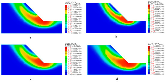 Figure 7. Equivalent plastic strain of slopes supported by tap roots with different lengths: (a) Bare slope, (b) 2 m tap root, (c) 3 m tap root, (d) 4 m tap root.