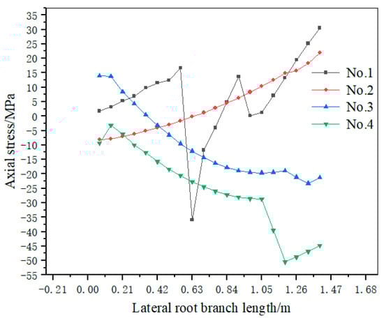 The root system with a 3 m tap root on the middle column of the slope toe was analyzed. For the symmetry of root distribution, lateral roots 1, 2, 3, and 4 were analyzed. Figure 10 shows that the No. 1 lateral root is mainly under tensile stress. The tensile stress first increases, then decreases, and then increases again, resulting in the maximum tensile stress at the root end. No. 2 lateral root is under compressive stress at its connection with the tap root; the compressive stress gradually decreases and then is under gradually increasing tensile stress, resulting in maximum tensile stress at the root end. No. 3 lateral root is under tensile stress at its connection with the tap root. The tensile stress gradually decreases, and then it is under gradually increasing compressive stress. No. 4 lateral root is mainly under compressive stress, and the compressive stress increases with the increase of its own branch length, and the maximum compressive stress generates at the root end.