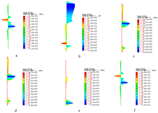 Figure 11. Tap root bending moment diagram of the first to sixth rows: (a) The first row, (b) The second row, (c) The third row, (d) The fourth row, (e) The fifth row, (f) The sixth row.