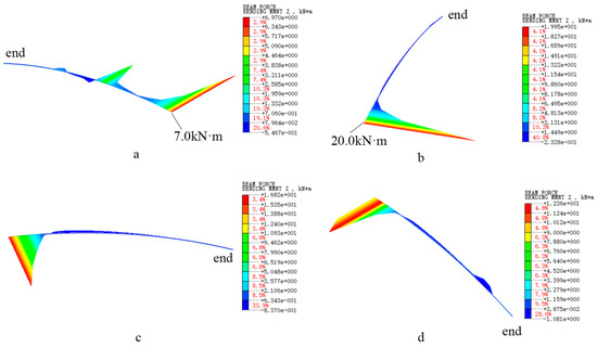 Figure 12. Bending moment diagrams of the first layer lateral roots: (a) No. 1 lateral root, (b) No. 2 lateral root, (c) No. 3 lateral root, (d) No. 4 lateral root.