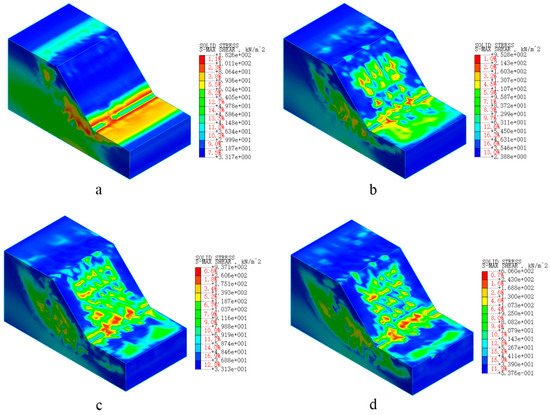 Figure 13. The shear stress of the slope: (a) The bare slope, (b) 2 m tap root, (c) 3 m tap root, (d) 4 m tap root.